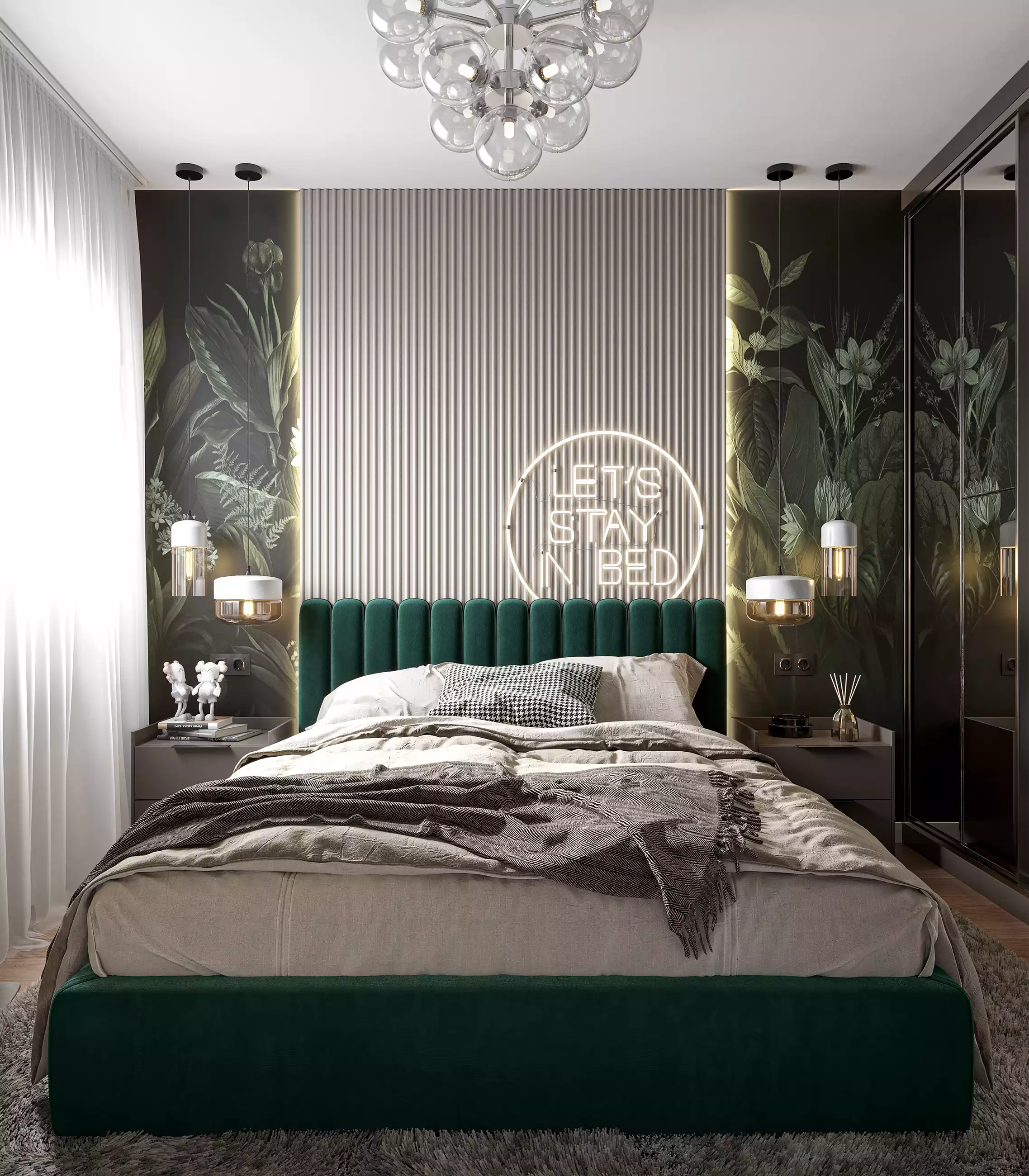 Spavaća soba u ovom stanu je najkoloritnije rešena. Ona je minimalno opremljena - osim kreveta, tu je samo komoda i klizni plakar. Zid iza kreveta ukrašen je dekorativnom tapetom kao i zidnim panelima koje smo koristili i u dnevnoj zoni.